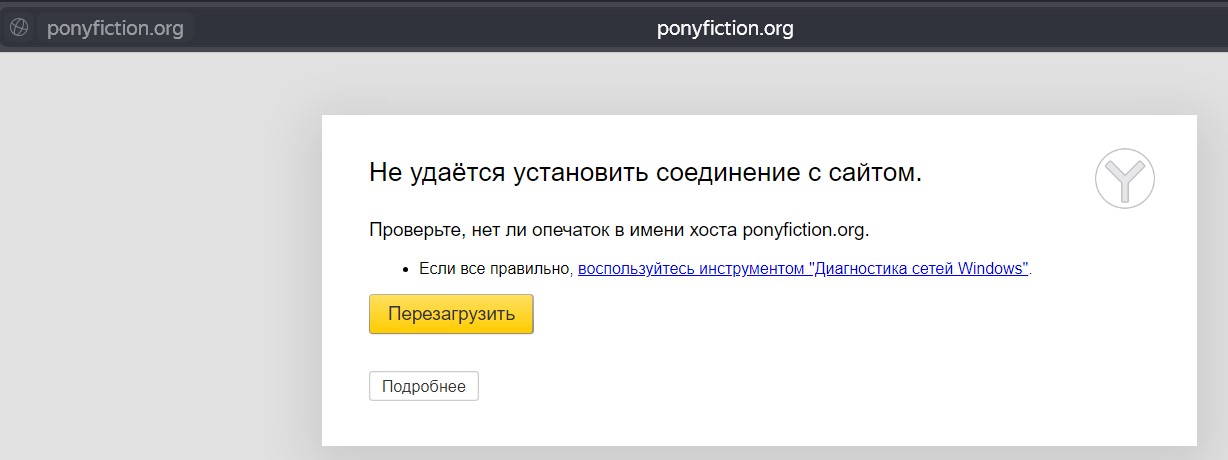 А вообще у меня сейчас половина сайтов не работают, походу, роскомпозор опять что-то мутит, и понификшен снова попал под раздачу…