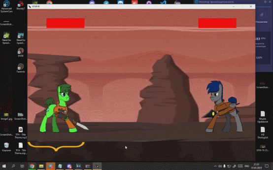 сначала я попытался сыграть в это с моим другом. То, что атаки проходят, только когда точка атаки попадает по поняхе/персу из гравити фолса — весьма странное решение. Вот скрин, как мы встали вплотную и тыкали по кнопке атаки, чтобы быстрее закончить бой. Требуется доработка хитбоксов и переделка зоны атак