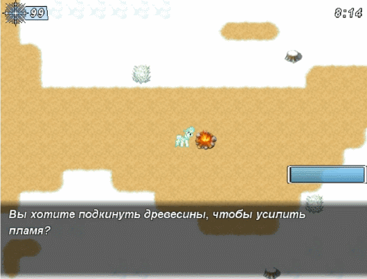 Описание: Вы собирали дрова на горе и нечаянно упали в овраг. С трудом собранная древесина разлетелась по дну. С печалью вы подготавливаете костёр… Выживите в мороз дольше 11 минут, чтобы вас успели найти и спасти. Внимание: когда открыты менюшки с выбором — время не идёт.
