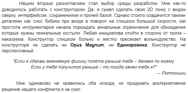 В любительском геймдеве, на мой взгляд, каждому кто доделал игру «до титров» можно памятник ставить — большинство проектов так и повисают, вроде «Андерворлд целло», которая очень бодро стартует, но оставляет чувство отобранной конфетки, когда гугл тебе говорит, что паззл попросту нерешаем в силу незаконченности игры. Я стараюсь на такое время не тратить, за редким исключением, то же самое с книгами-переводами.