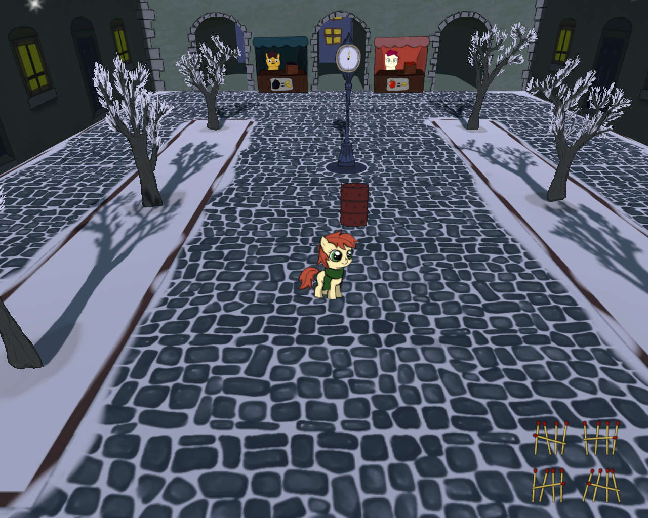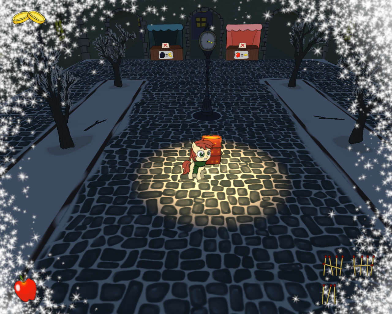LittleTinyBit — The Little Match Filly: 9Мило, грустно и весьма сложно из-за лютого рандома с получением денег и псов… Почему собаки деньги воруют? Это уже прям излишнее было. Ладно ещё спички, но деньги? Из-за них и так время пропускается, куда ЕЩЁ наказывать? Особенно с тем, что после второго дня можно получить монетку и сразу же и её потерять, и время из-за того, что пока происходил процесс обмена подошла собака и начала толкать поняху… Не осилил, ибо умирал стабильно на четвёртой ночи. Без еды вообще никак, похоже