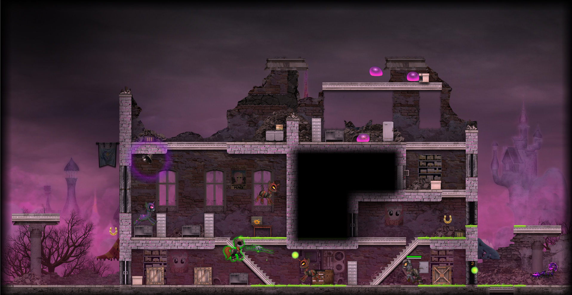 По началу машины, изучая этот мир, будет создавать весьма слабых зомби-подобных земных пони, но со временем главному герою придется столкнуться с весьма проворными и мощными противниками.