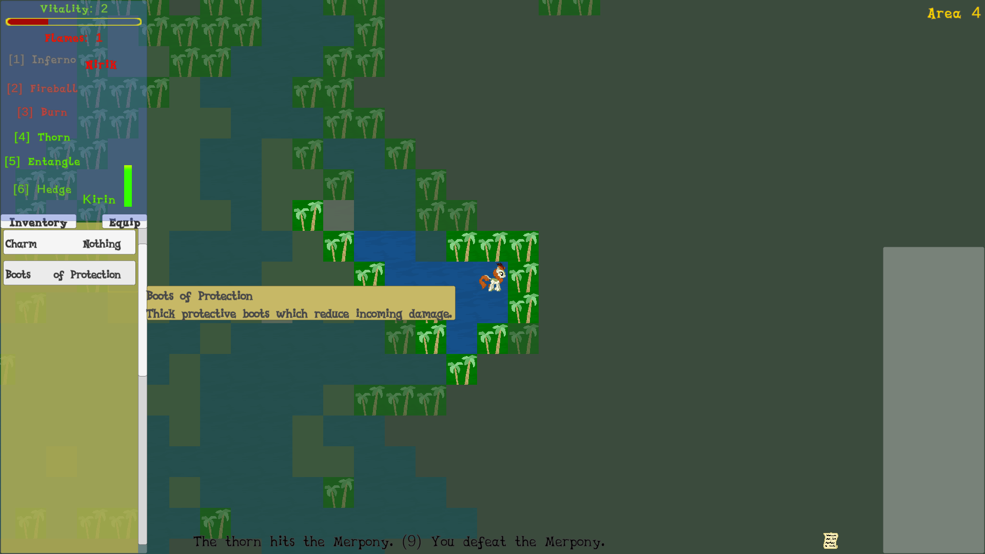 Способность Кирина: Толчок, которая отталкивает и наносит урон всем соседним врагам, создавая преграды на соседних клетках. Также создаёт воду на клетке игрока и не может быть использована, находясь в воде.