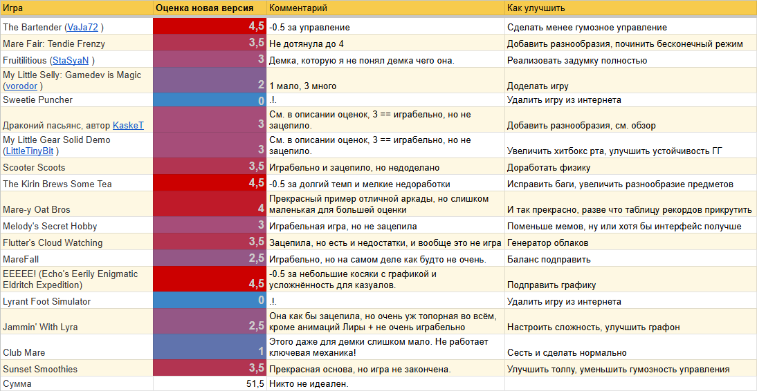 Можно кидать в меня репорты, я буду их учитывать, но посмотреть на финальный результат — не скоро. А так всем спасибо за фидбек, для первого раза с такой динамичной штукой я думал, что выйдет хуже, лол