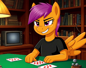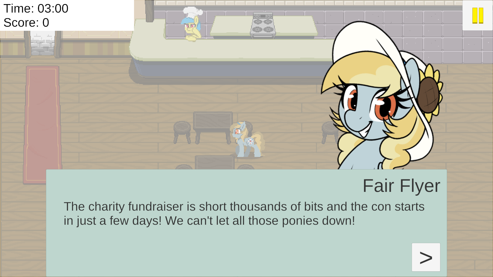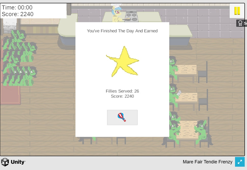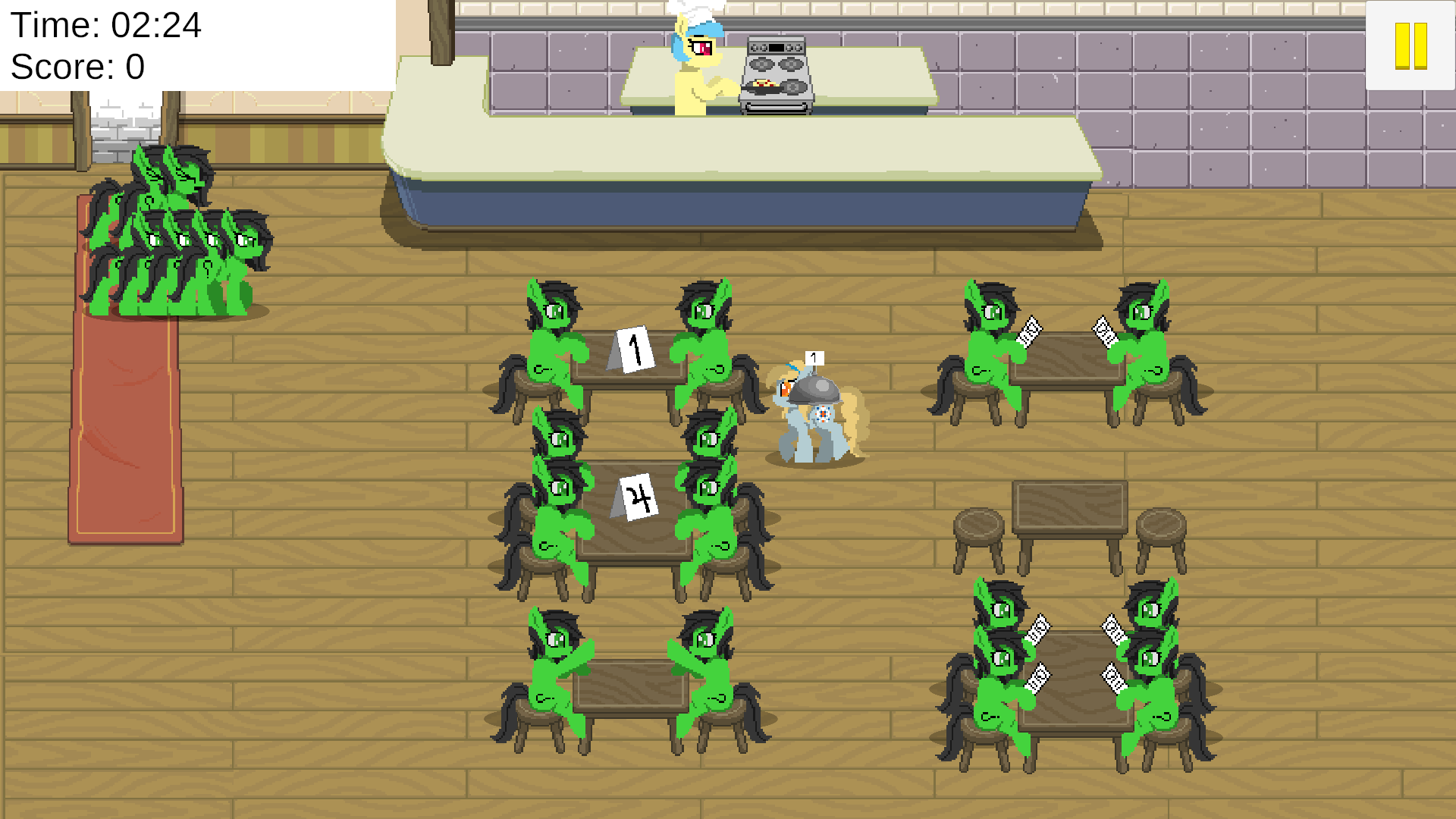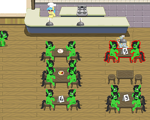 Игра про обслуживание клиентов: нужно проводить анон-кобылок к столикам, взять их заказ, принести заказ, выпроводить, повторить. Нужно следить за клиентами, потому что долго ждать вас они не захотят.