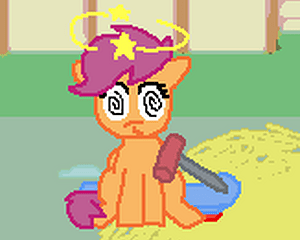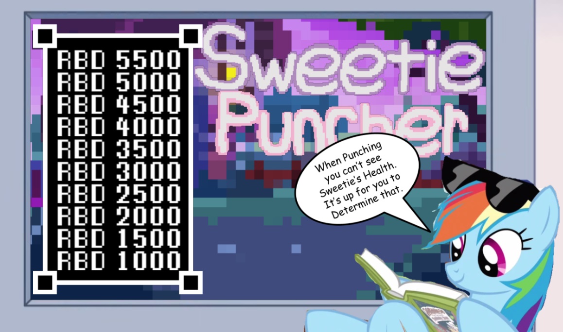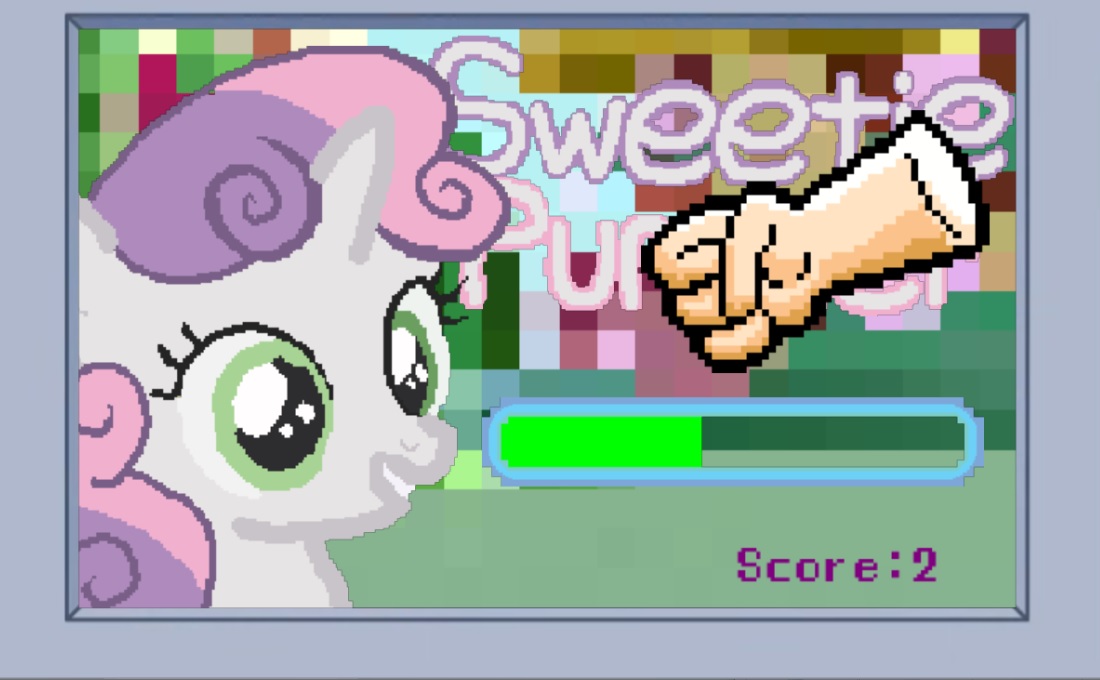 ссылкаОписание:… э, ну, там надо прижимать мужицкий кулак к мордочке Свитти Белль… типа кликера, только кликать нужно в особом ритме, чтобы не забить слишком сильно и не простаивать слишком долго. По сюжету это типа любимая видеоигра Рэйнбоу Дэш и она говорит, что её рекорд в 5500 вам не побить