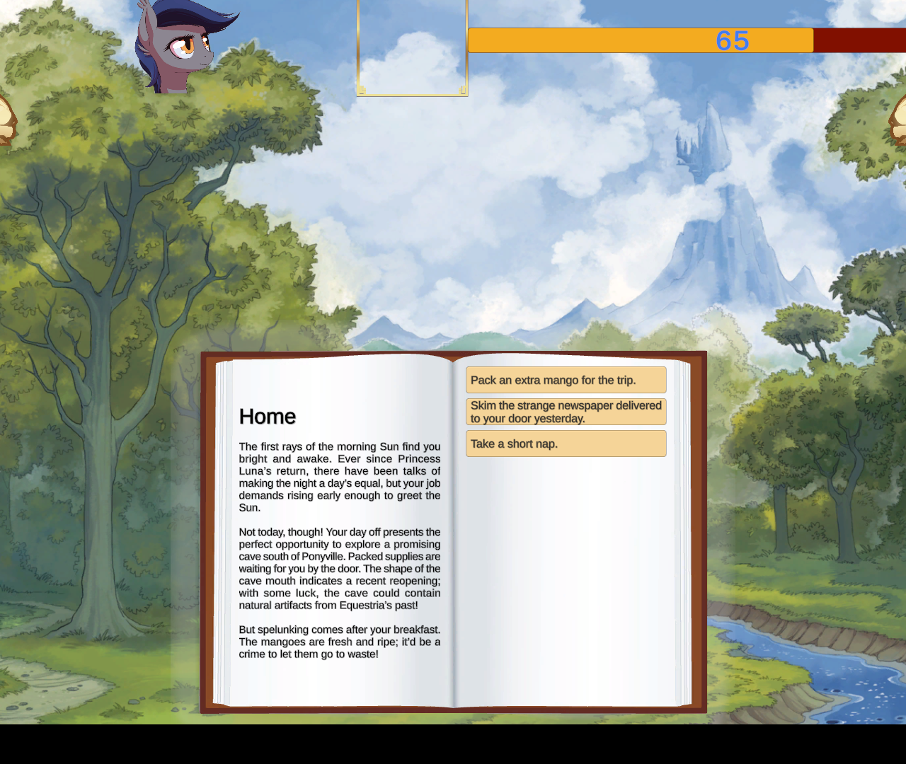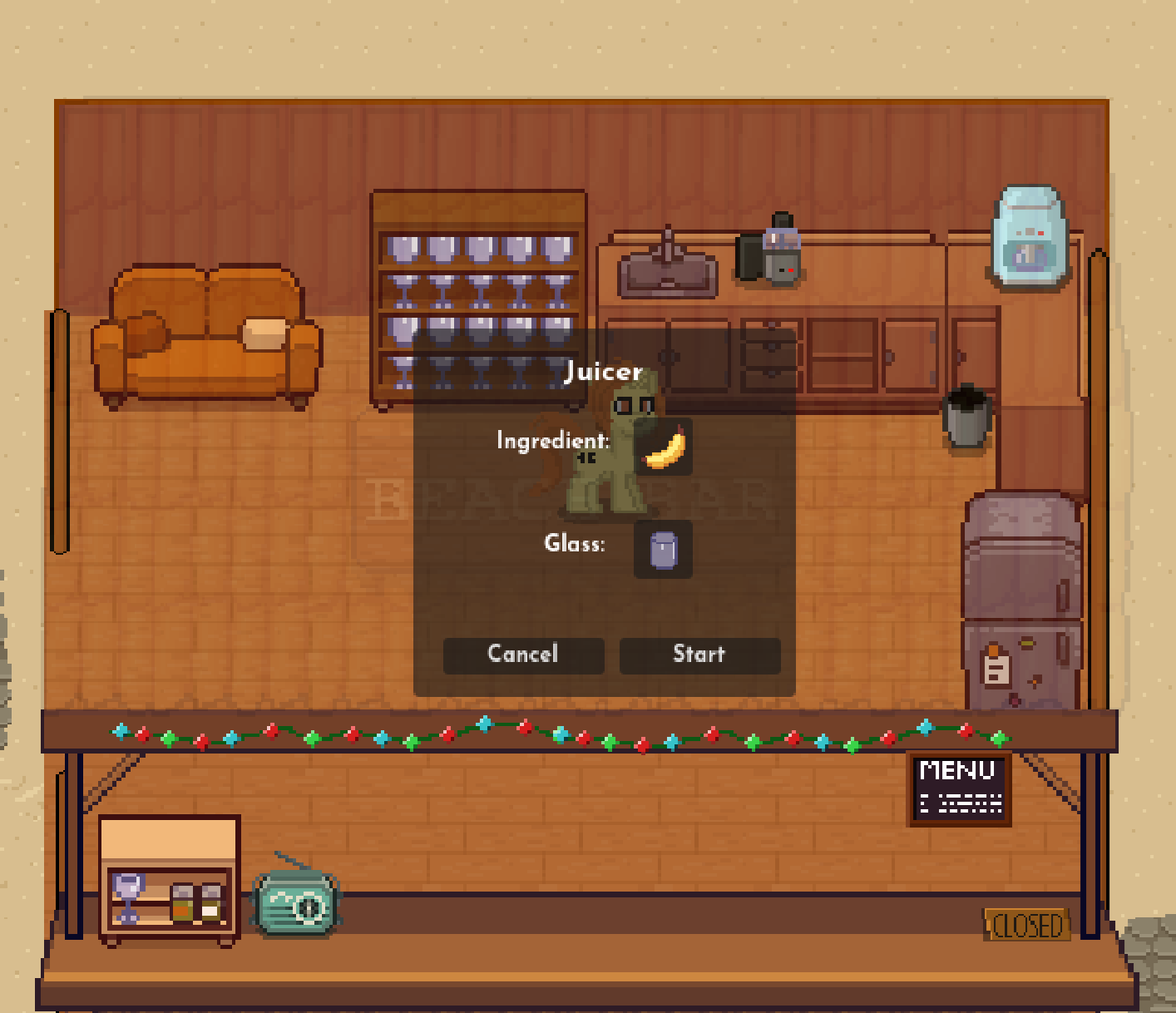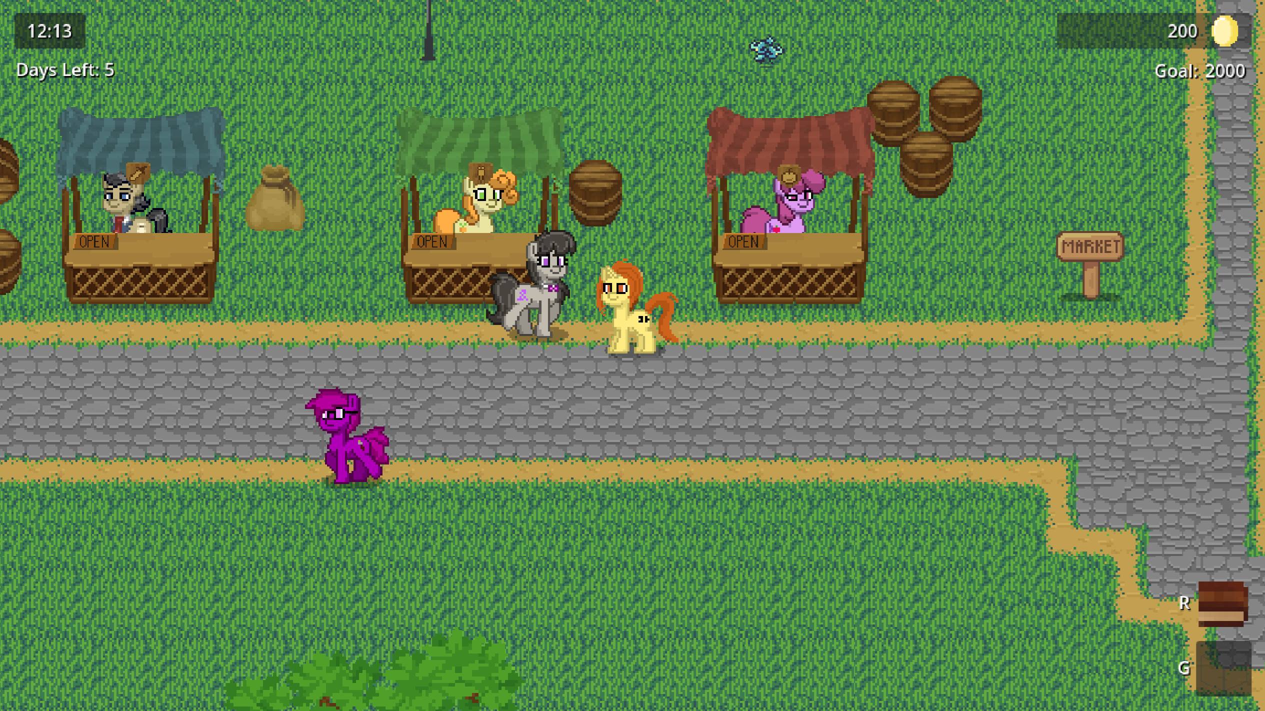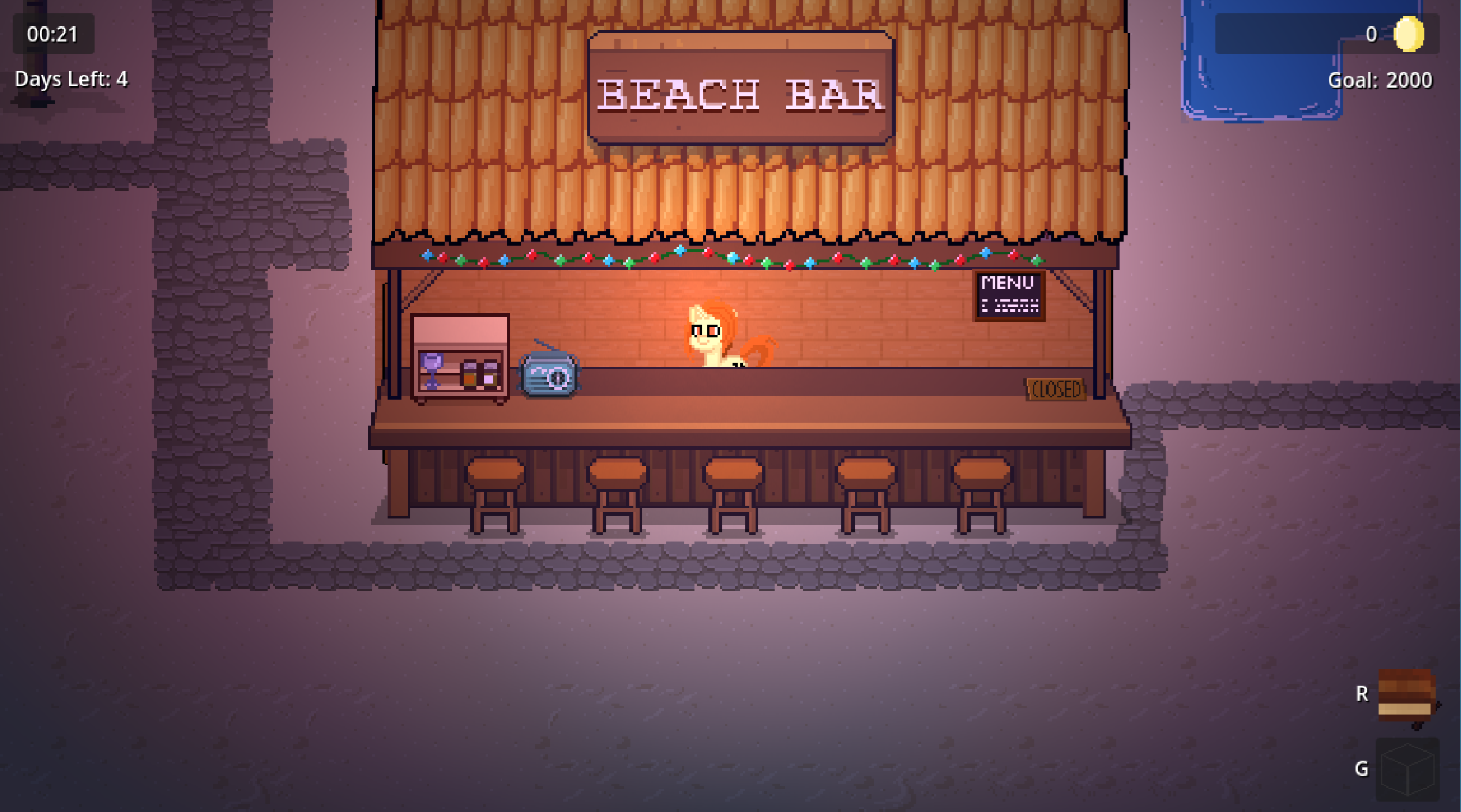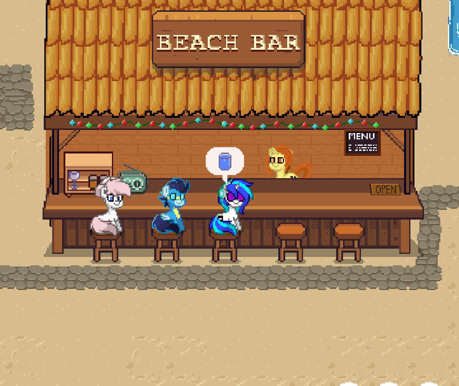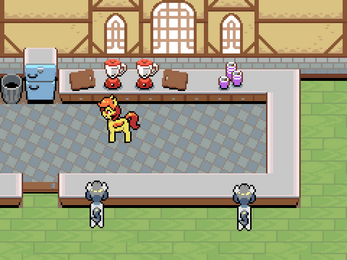 ссылка (можно играть с браузера)Описание: Вы играете за пони, которая увлекается барменством. Вы только что купили бар рядом с пляжем, и вам нужно заработать на аренду за 5 дней, продавая напитки другим пони.