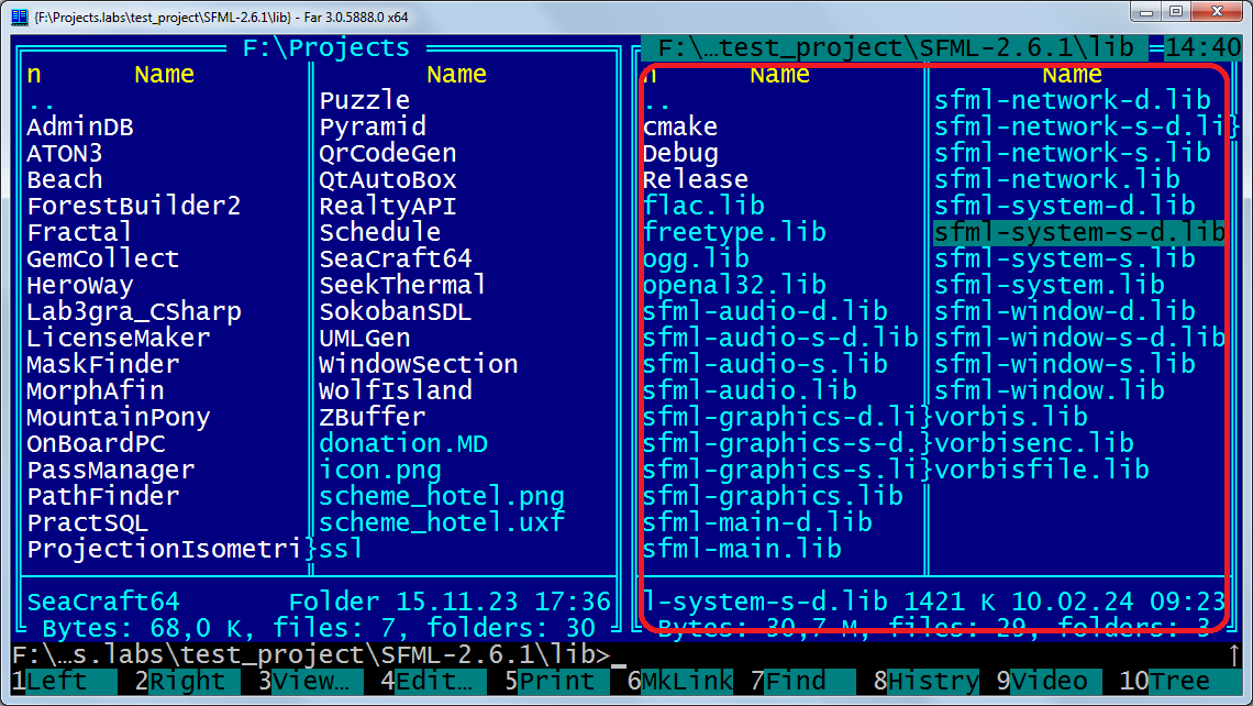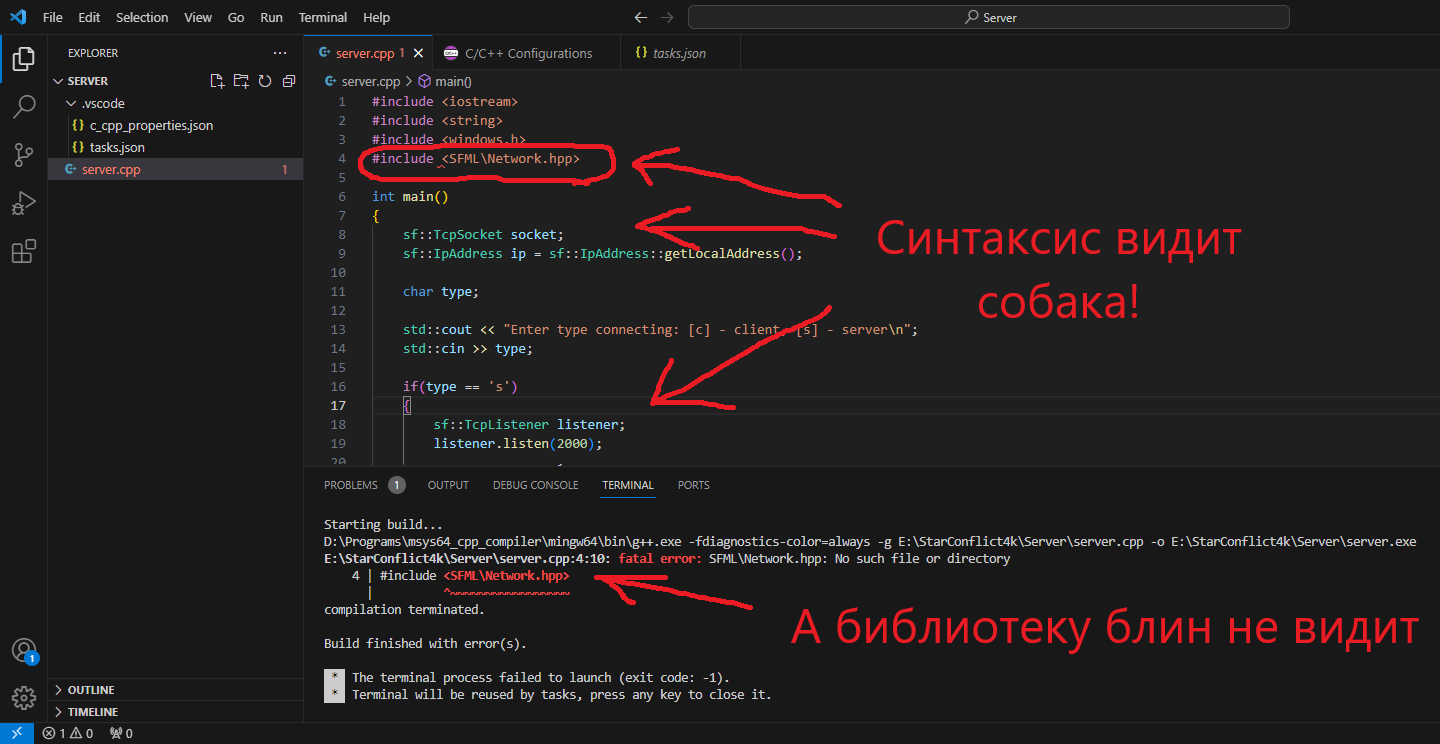 Значит скачал я SFML библиотеку с официального сайта, как положено, под Visual C++ 17 (2022) — 64-bit, вроде на сайте Visual Studio тоже написано что он 22-го года, хотя последнее обновление всего три дня назад было. В общем распаковал я это дело как написано в инструкции, а дальше трэш угар и содомия: на сайте SFML настройка идёт через проекты, которых в моей версии Visual Studio тупо нету, толи это прерогатива платной версии, толи ещё чего, но их тупо нет в меню, на сайте VS вообще чёрт ногу сломит. В итоге нагуглил вроде гайд, где просто добавляется дополнительный Include Path для папки с новыми библиотеками, и вроде как оно даже почти работает, по крайней мере синтаксис подключённой библиотеки VS видит, вот только при попытке скомпилировать экзешник через g++, эта тварь выдаёт фатальную ошибку, мол нема такого файла: