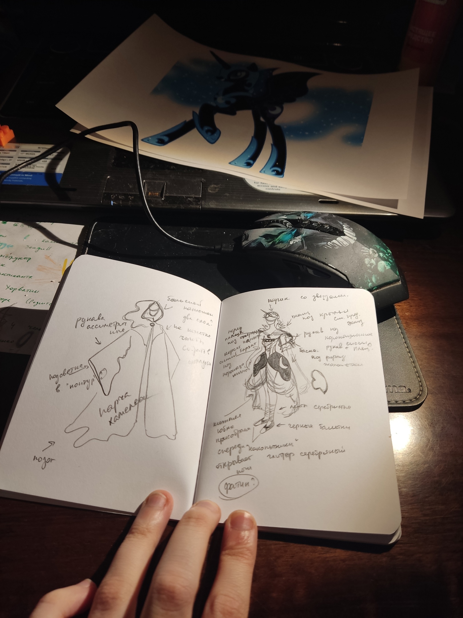 Что ж. Открываем скетчбук, начинаем творить и вытворять. Логично же подумать, что мы делаем объёмный плащ, с капюшоном, который имитирует «гриву». Добавляем ассиметричные рукава…