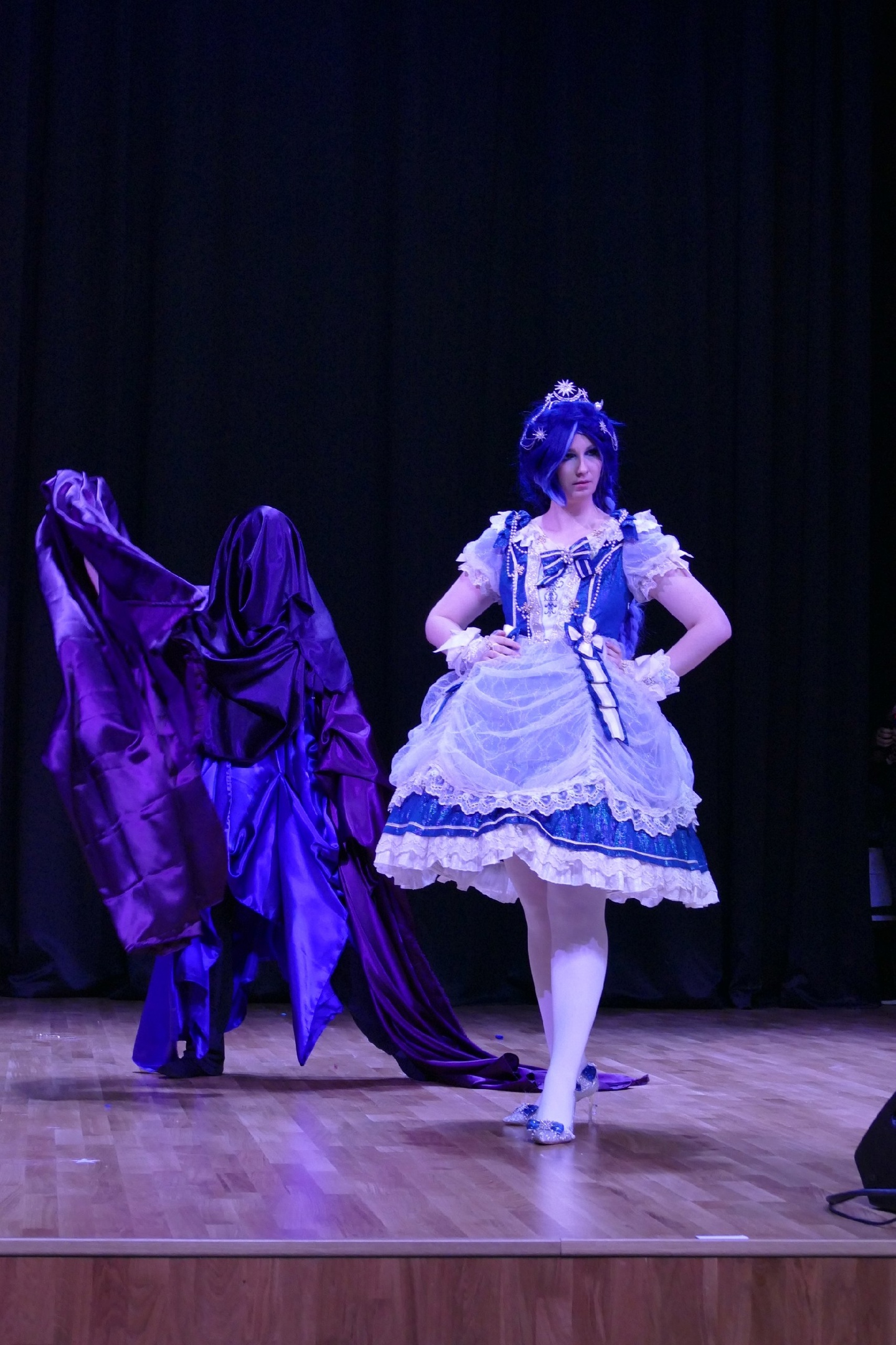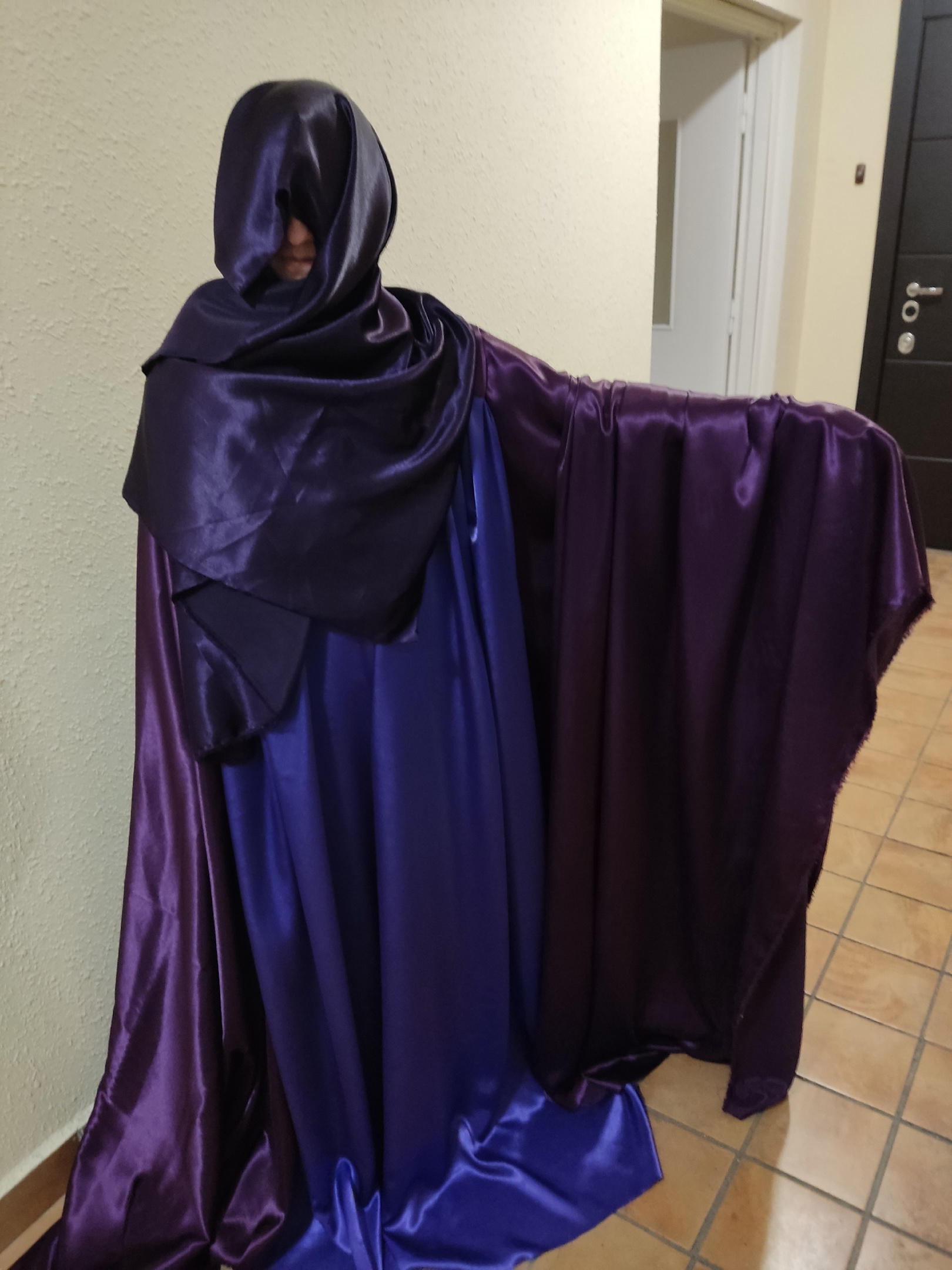 Который затем (ну, у нас же сцена 7*10 (тогда ещё думали мы) был пошит в плащ с мегарукавами. А то, что планировалось просто капюшоном — полностью закрыло лицо… Ибо «О, а я тебя вижу!»