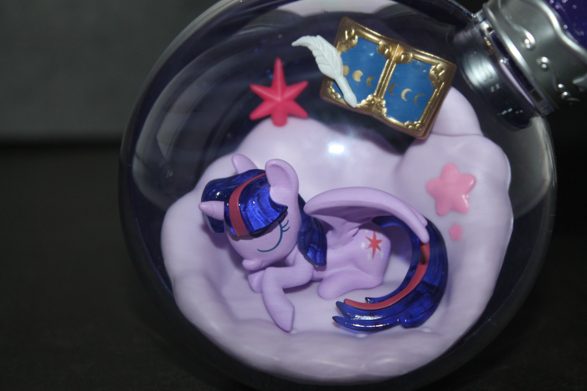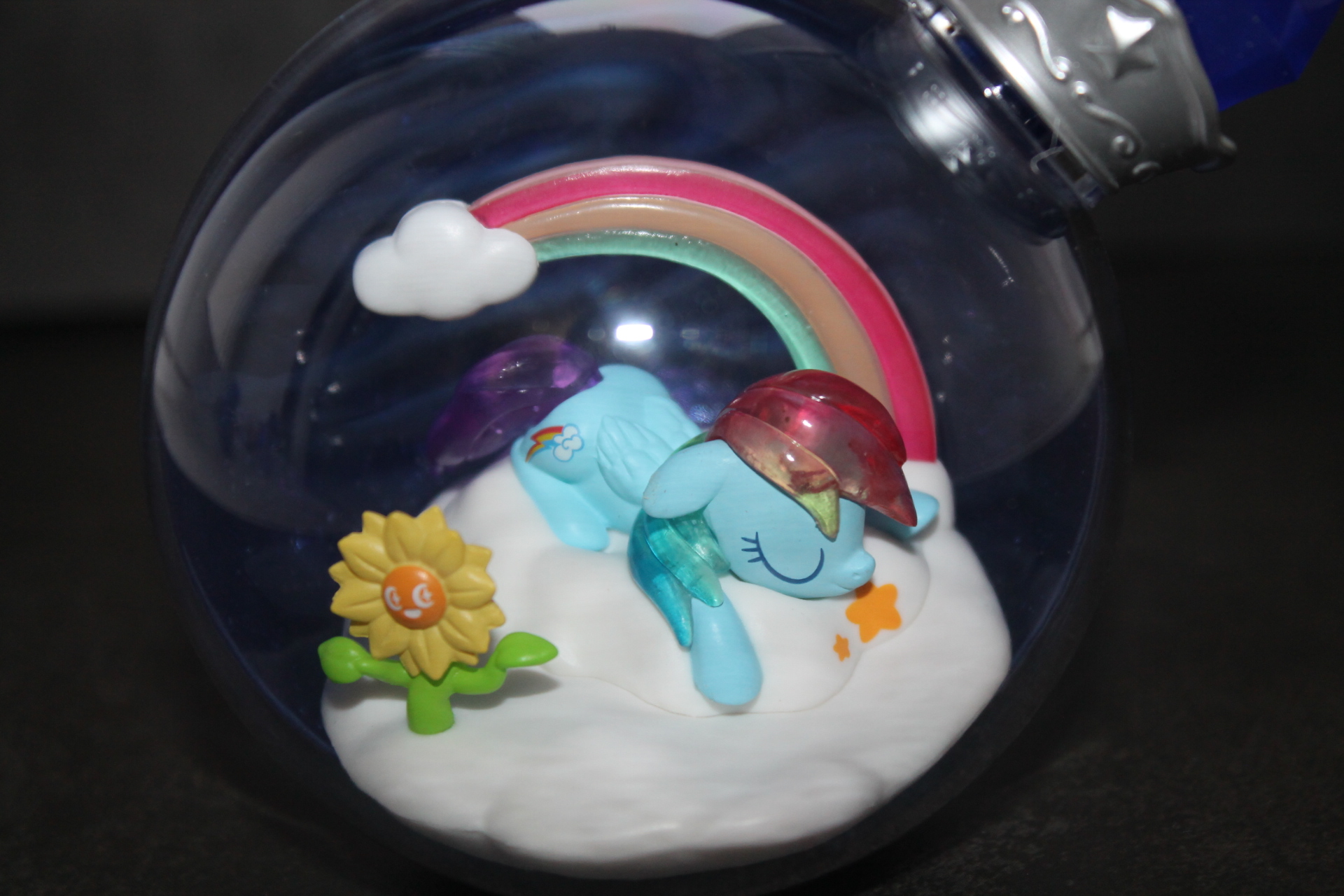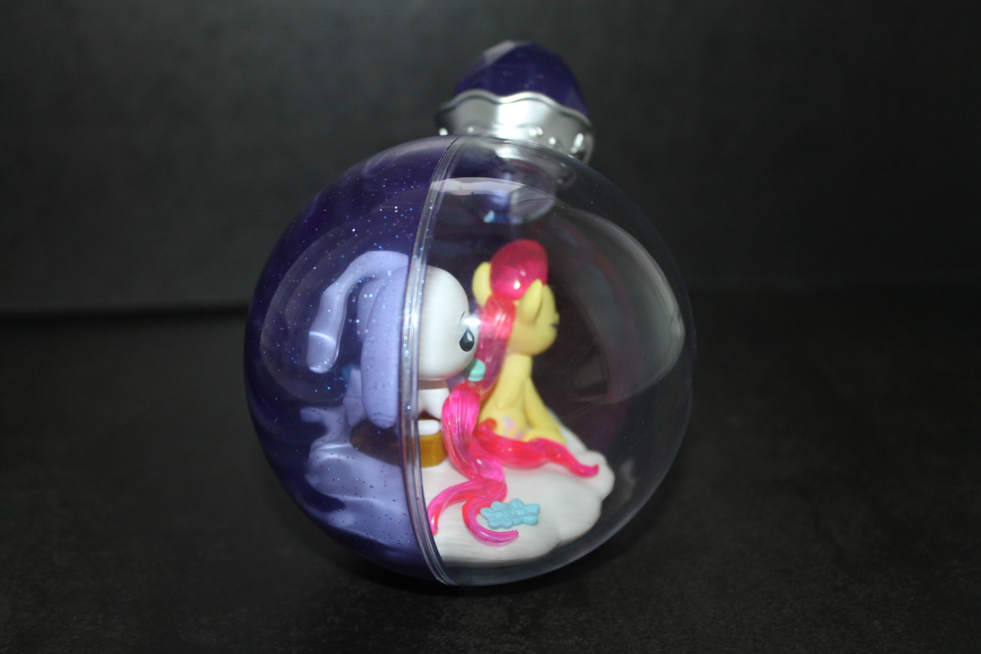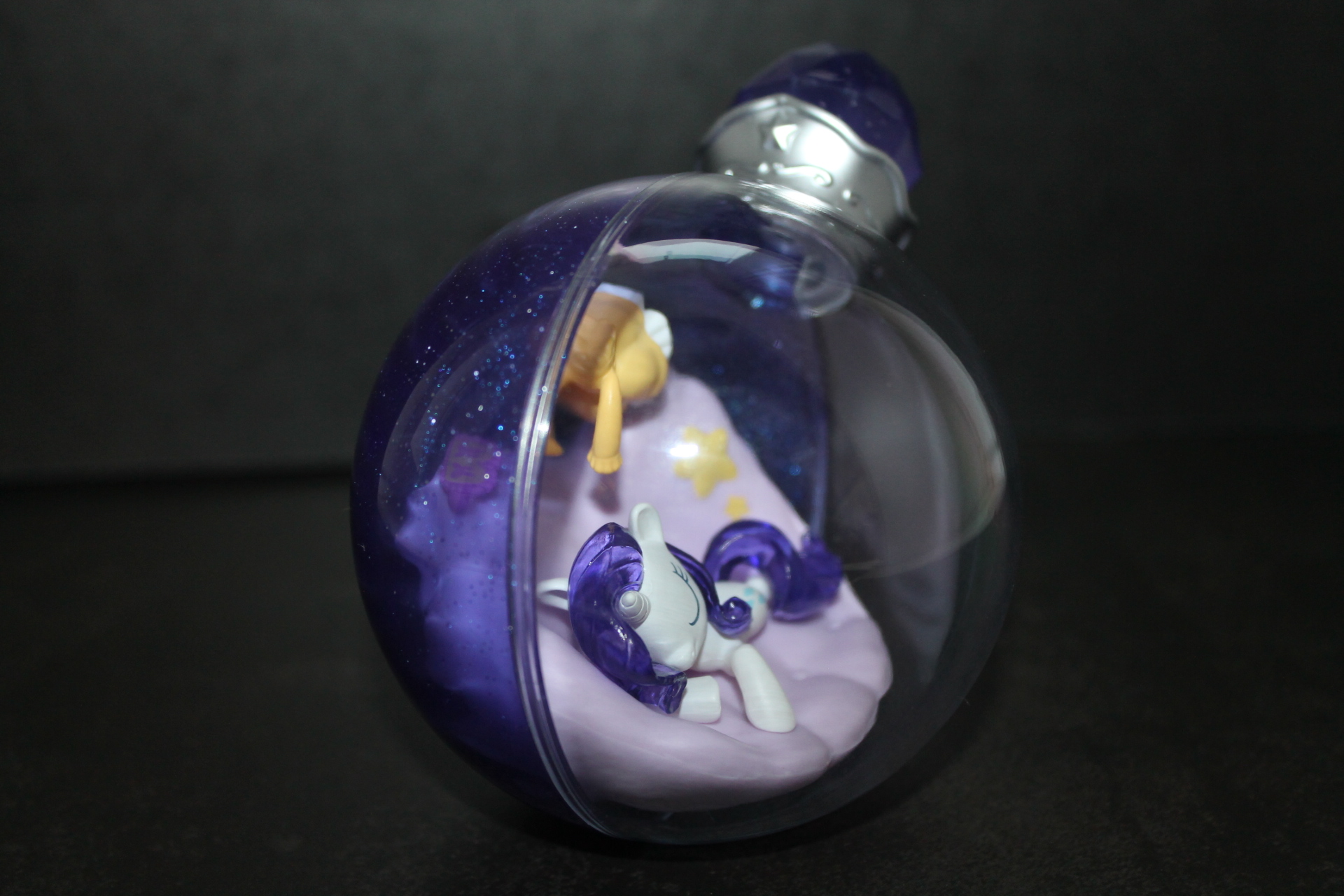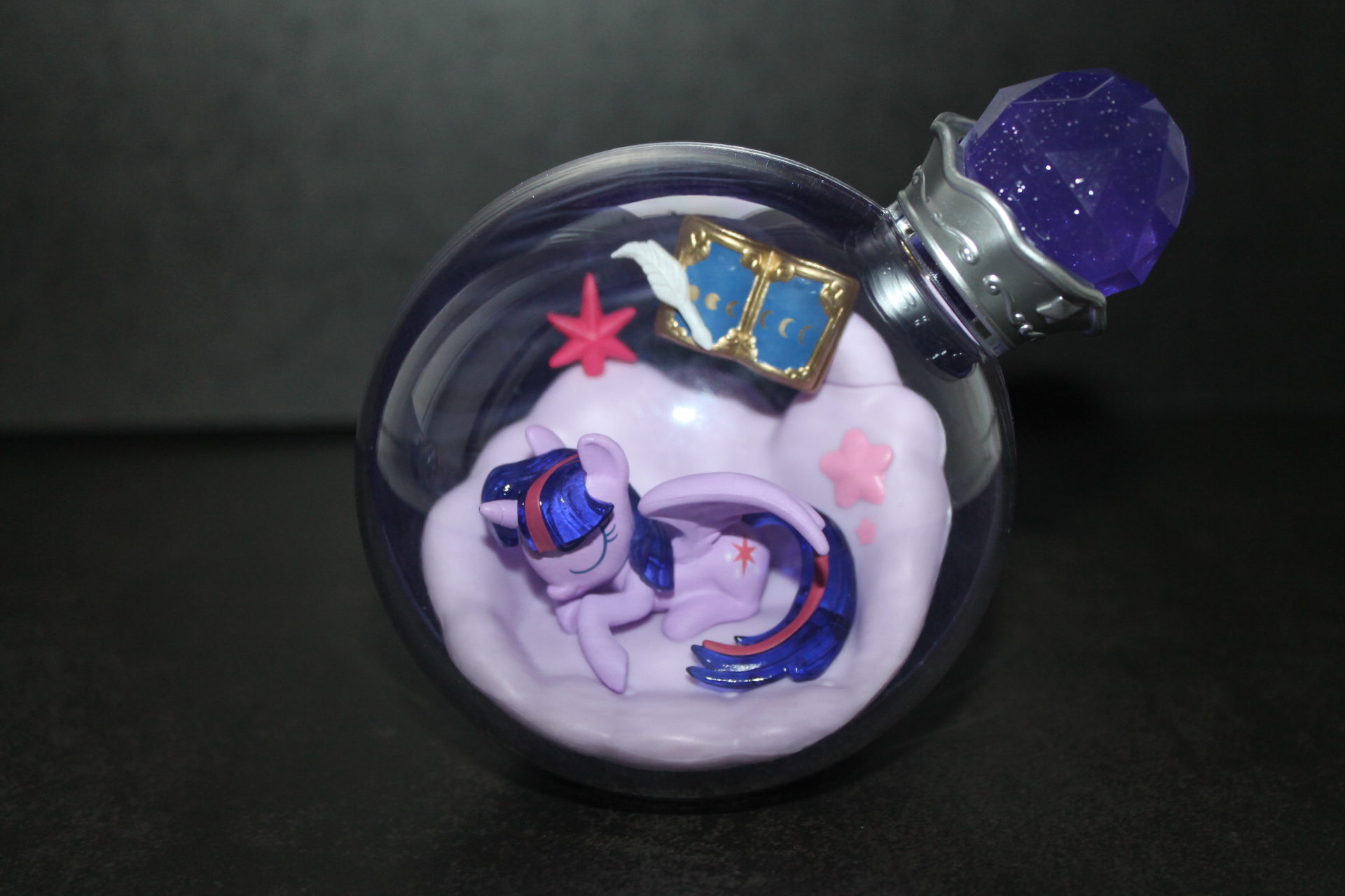 Если в прошлой волне задняя сторона бутылочек была разноцветной, то теперь они все одинакового сине-фиолетового оттенка, примерно, как у Рэрити ранее, к тому же, теперь внутрь пластика цветной части колбы добавили блёстки. Бутылочки теперь плотно закрыты пробкой и из них ничего не «вытекает». При этом на полке они могут стоять вполне устойчиво, благодаря горизонтальному участку в основании сферы. Можно ли вынуть пробку я не пробовал, вероятно да, и тогда половинки бутылочки можно будет безопасно разделить, если это кому-то понадобится. Кстати, многие элементы окружения внутри бутылочек являются прямой отсылкой к снами пони в 13-й серии 5-го сезона «Do Princesses Dream of Magic Sheep?». Угадаете какие именно?