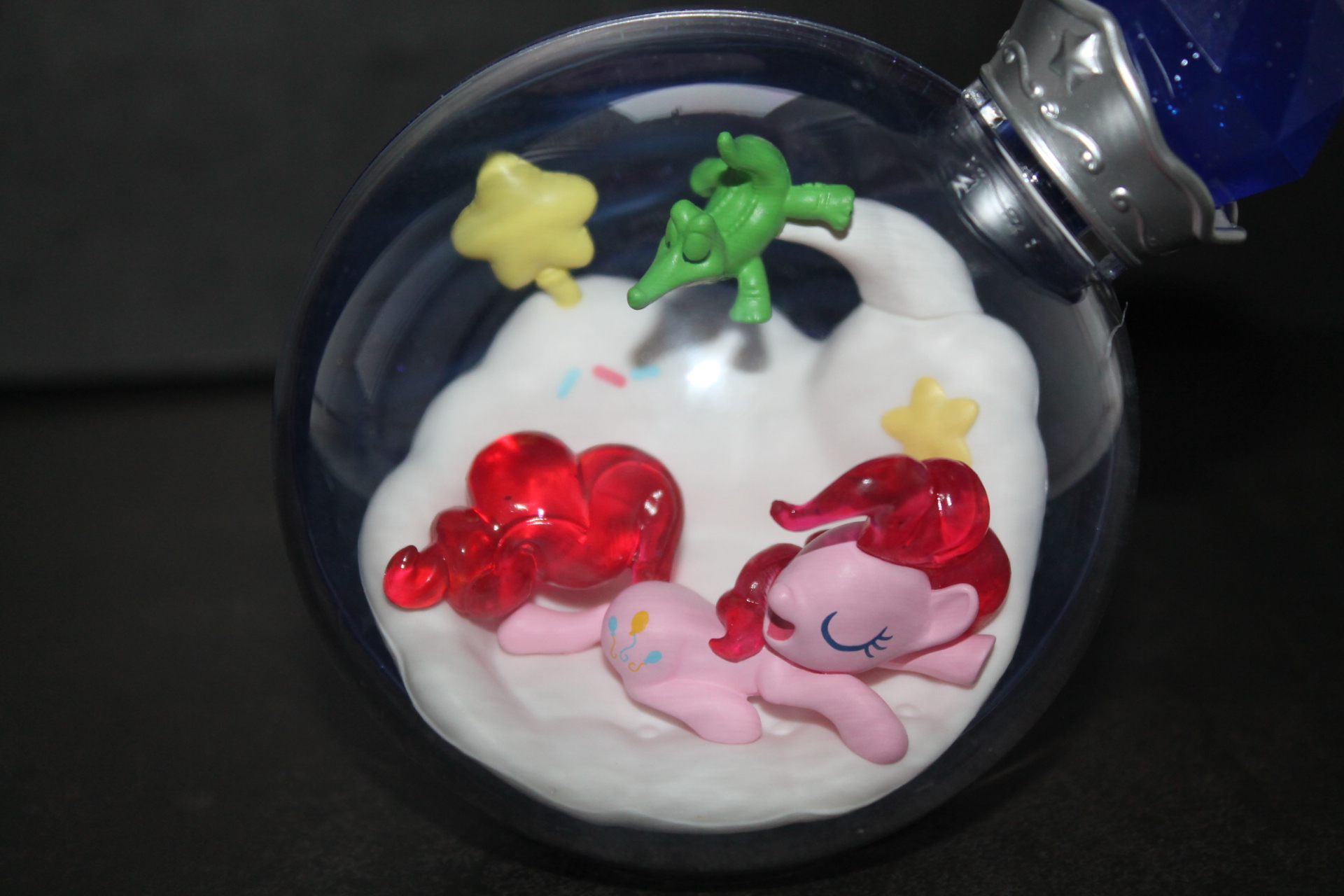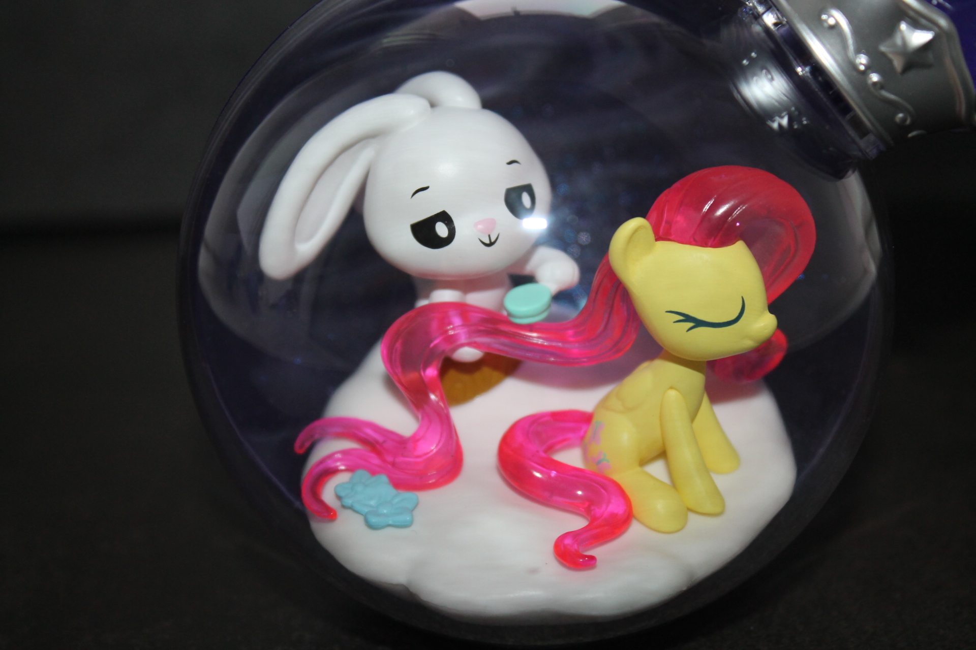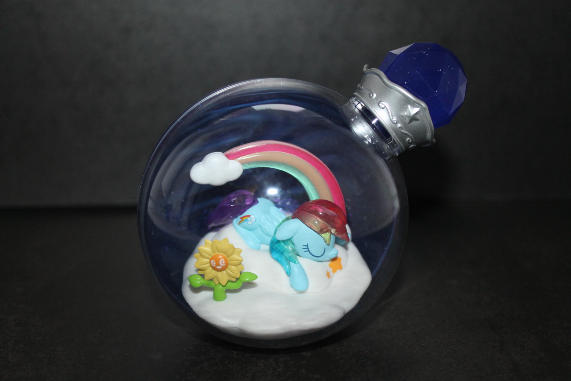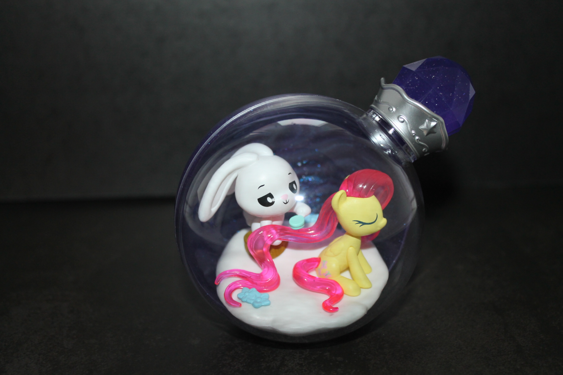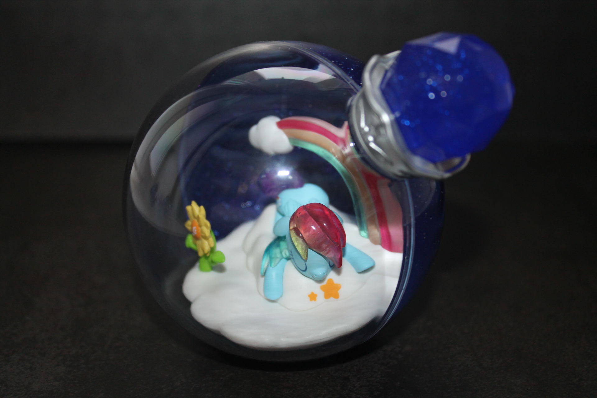 Если в прошлой волне задняя сторона бутылочек была разноцветной, то теперь они все одинакового сине-фиолетового оттенка, примерно, как у Рэрити ранее, к тому же, теперь внутрь пластика цветной части колбы добавили блёстки. Бутылочки теперь плотно закрыты пробкой и из них ничего не «вытекает». При этом на полке они могут стоять вполне устойчиво, благодаря горизонтальному участку в основании сферы. Можно ли вынуть пробку я не пробовал, вероятно да, и тогда половинки бутылочки можно будет безопасно разделить, если это кому-то понадобится. Кстати, многие элементы окружения внутри бутылочек являются прямой отсылкой к снами пони в 13-й серии 5-го сезона «Do Princesses Dream of Magic Sheep?». Угадаете какие именно?
