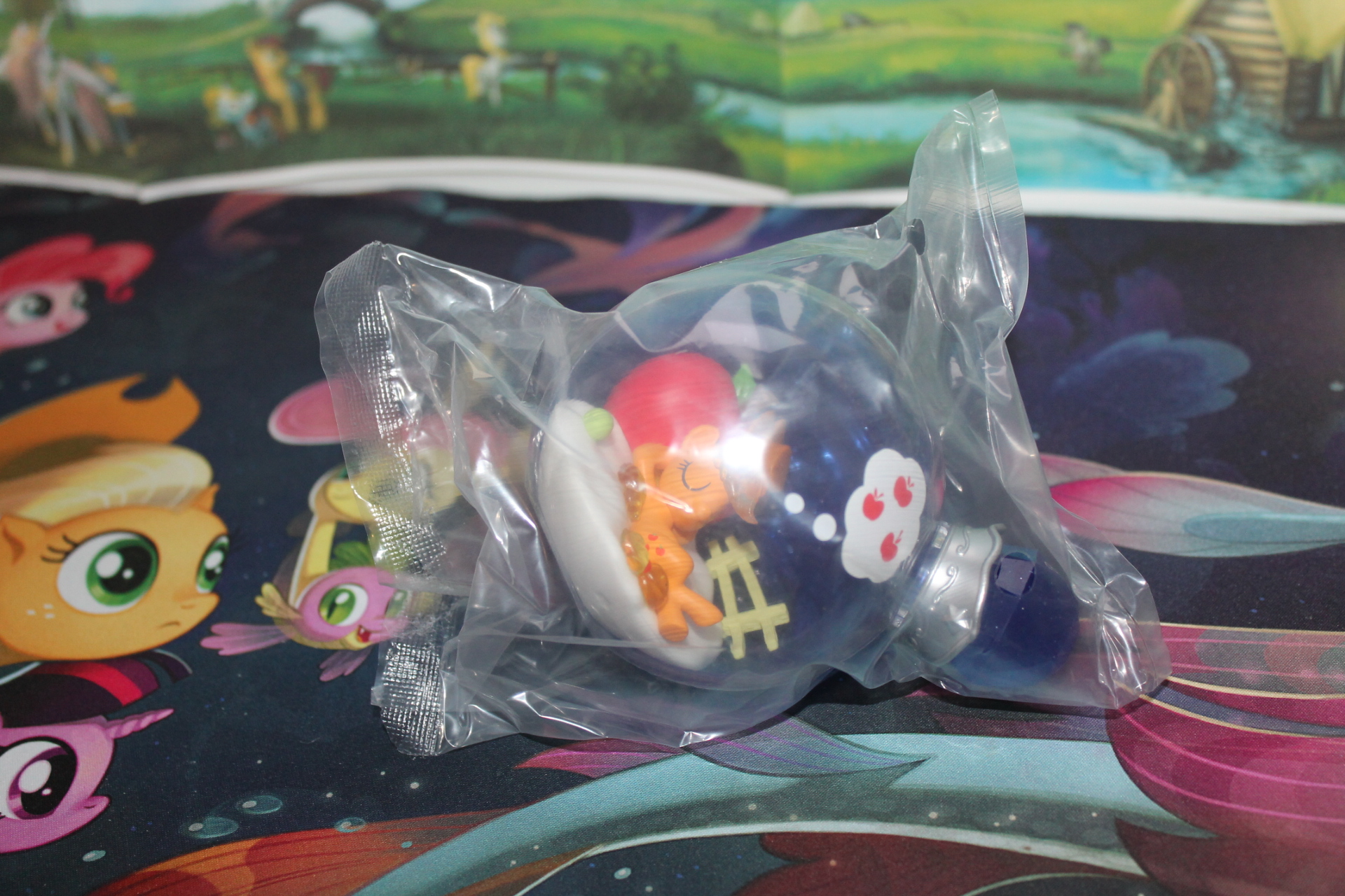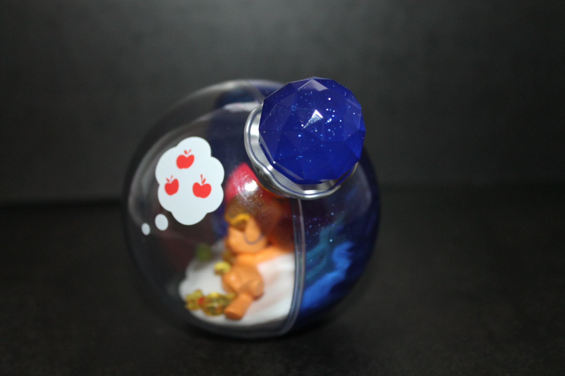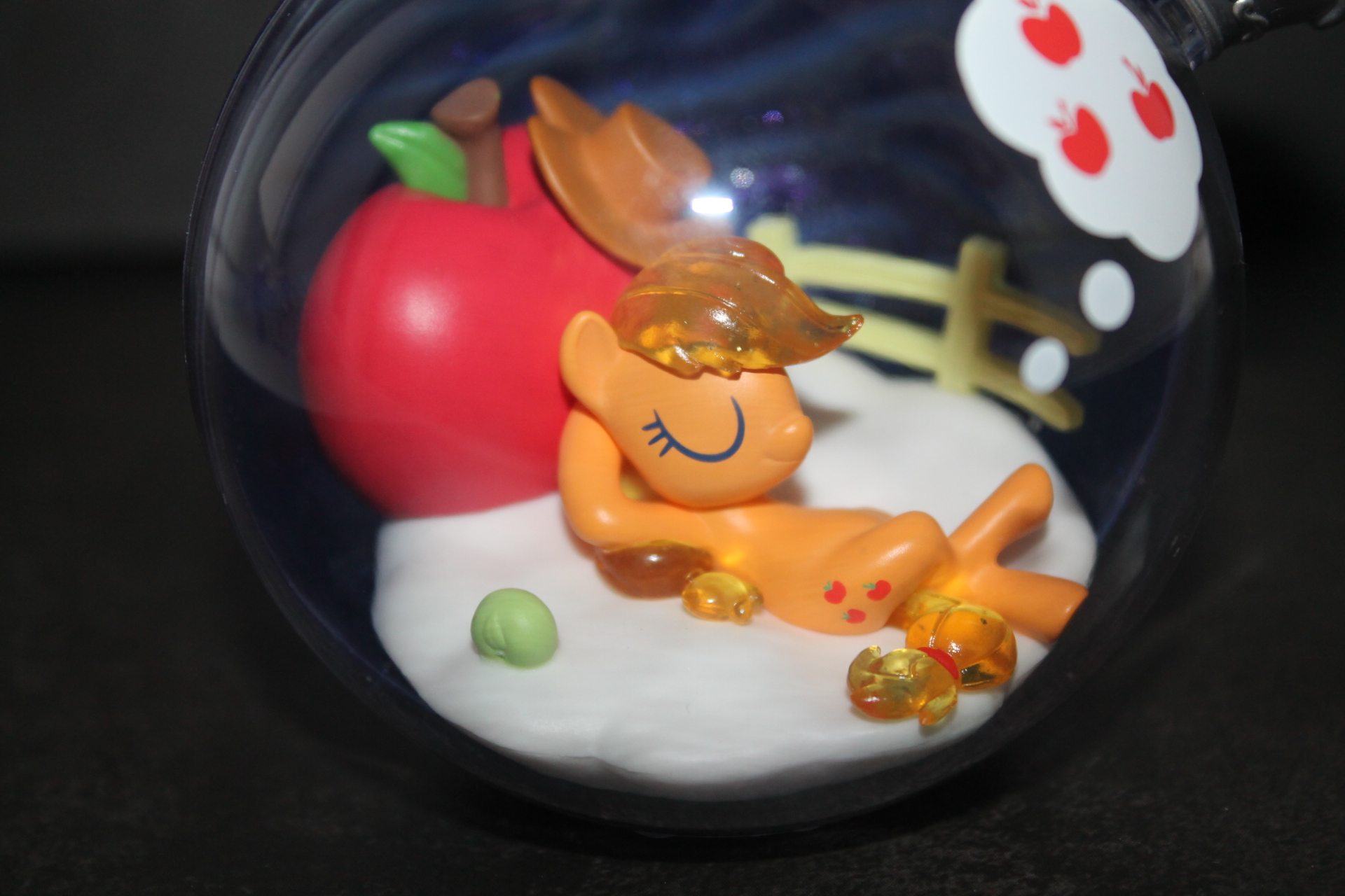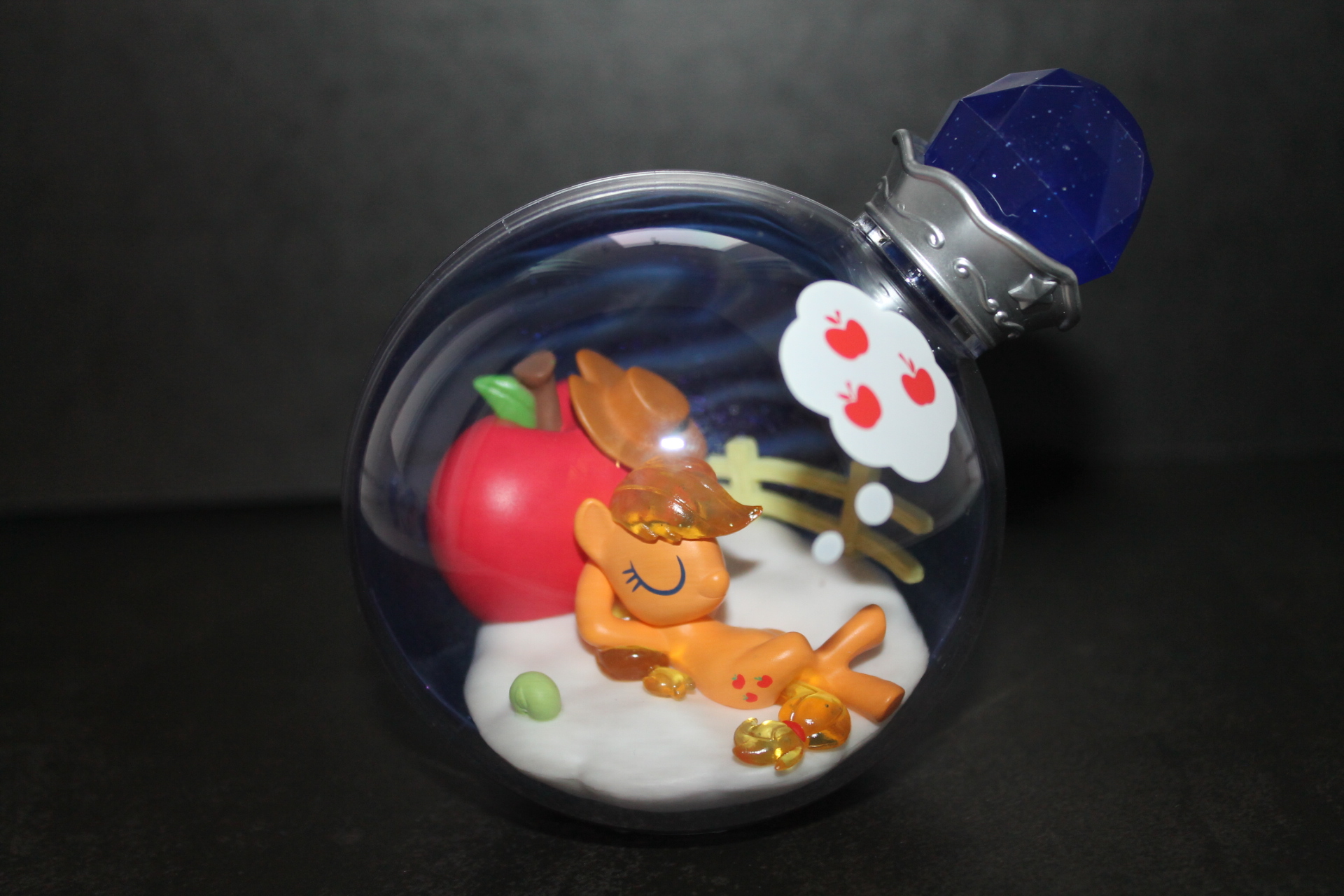 О чём ещё может грезить яблочная пони, как не о яблоках. Единственная фигурка (не считая редкой Флаттершай), где это буквально изображено на поверхности колбы.